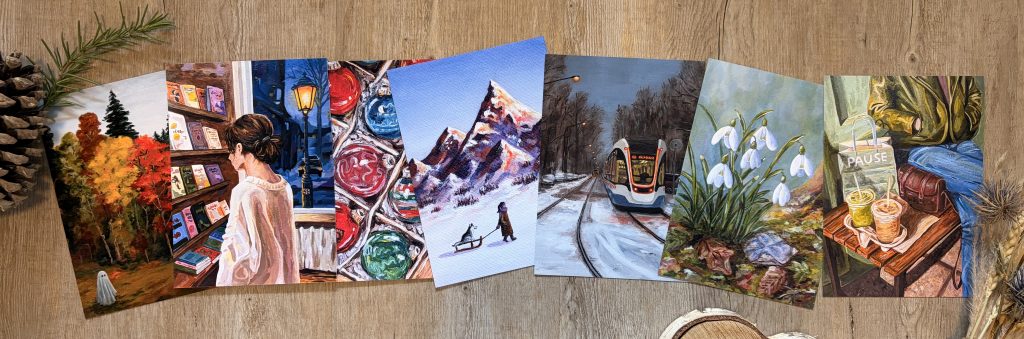 Einen hochwertigen saisonalen Kunstdruck in der Größe 13×18 cm, einen persönlichen Brief und kleine Überraschungen wie Lesezeichen oder Postkarten. Alles mit viel Liebe in einem hübschen Umschlag verpackt, monatlich zu dir nach Hause.