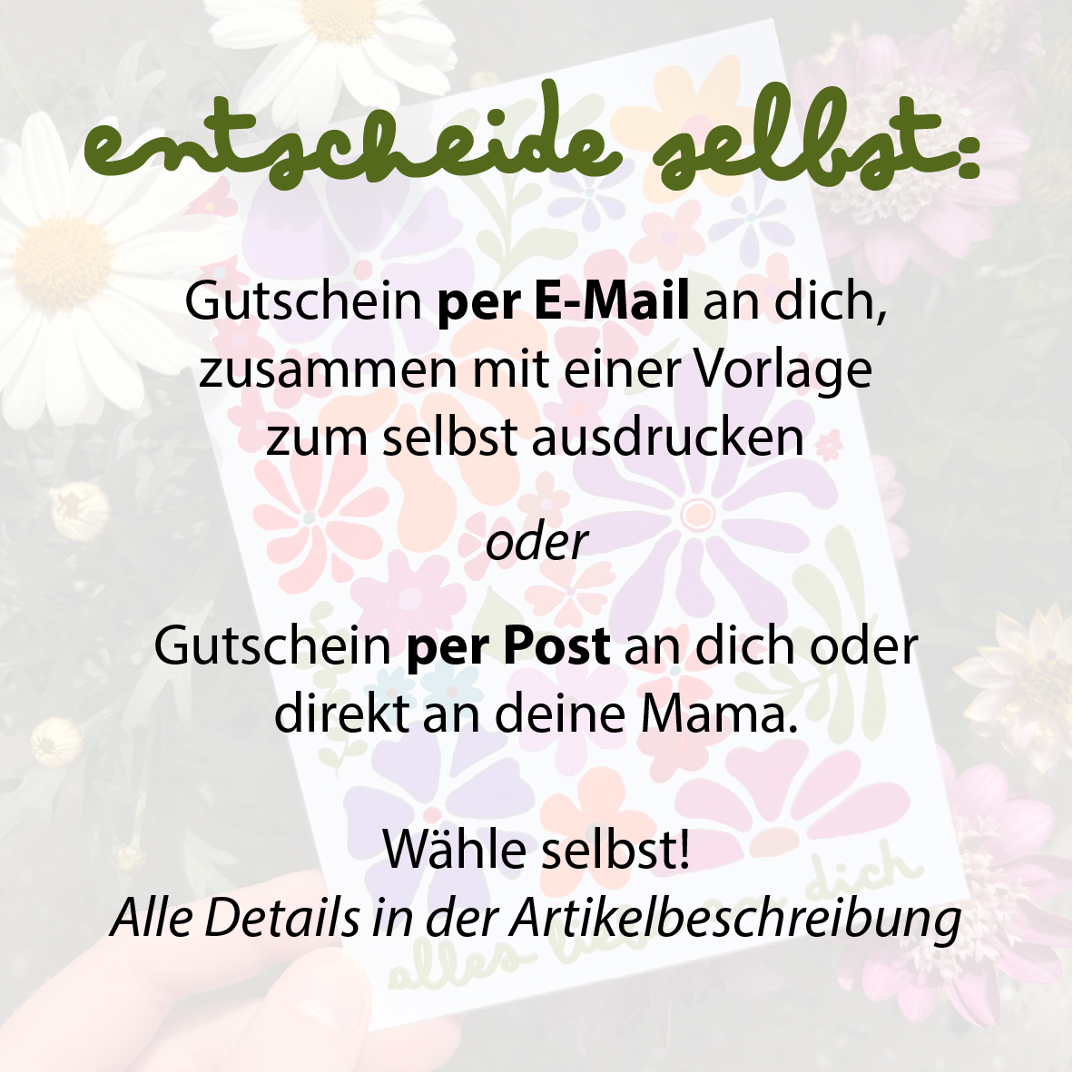 Du bekommst den Gutschein als hübsche Blumenkarte.- Versand zu dir, damit du ihn persönlich überreichen kannst