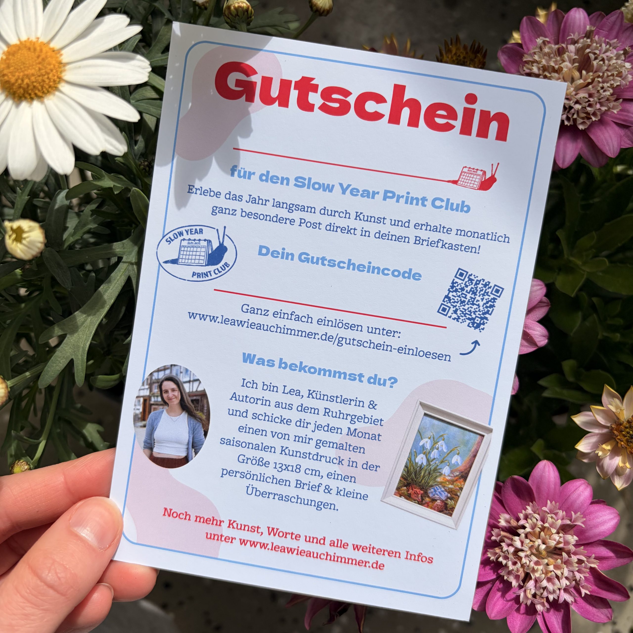 Der Gutschein kann ganz einfach zu einem beliebigen Zeitpunkt eingelöst werden. Die beschenkte Person wählt auf meiner Website unter leawieauchimmer.de/gutschein-einloesen einfach das Abo aus, dass sie geschenkt bekommen hat, z.B. „Print Club Deutschland 6 Monate“ und gibt den Gutscheincode und ihre Adresse ein. Dadurch kann sie auch selbst bestimmen, wann das Abo starten soll. Alle Schritte sind auch nochmal auf dem Gutschein selbst erklärt.